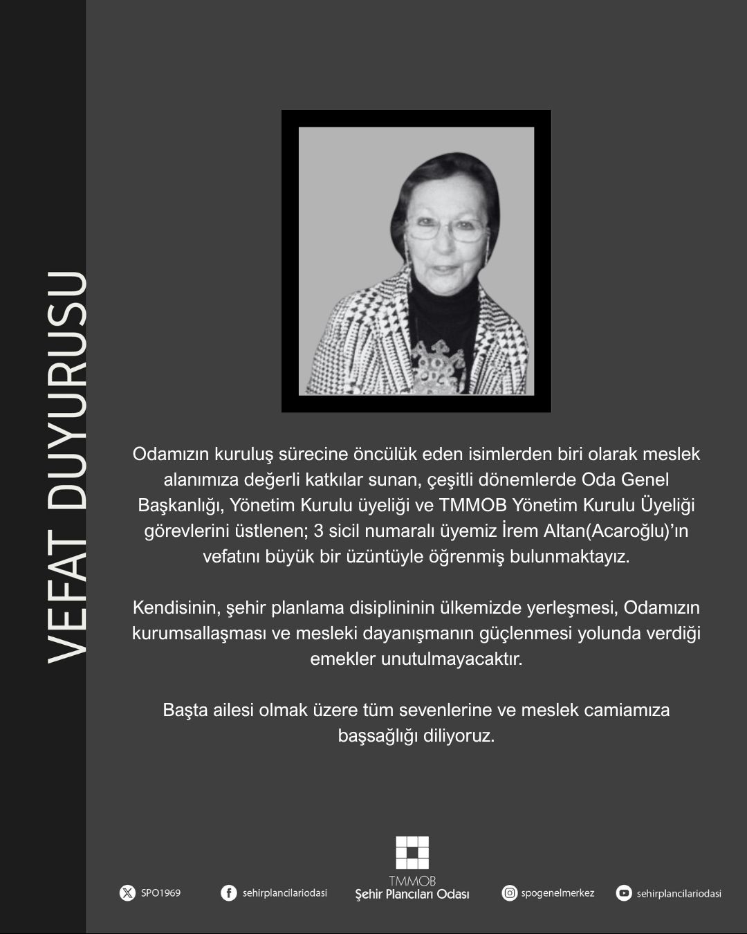 Odamızın kurucu üyelerinden, çeşitli dönemlerde Oda Başkanlığı, Oda Yönetim Kurulu üyeliği ve TMMOB Yönetim Kurulu üyeliği görevlerini yürüterek meslek örgütlülüğümüzün gelişimine ve güçlenmesine değerli katkılar sunan üyemiz İrem Altan(Acaroğlu)`ın vefatını derin bir üzüntüyle öğrenmiş bulunmaktayız.