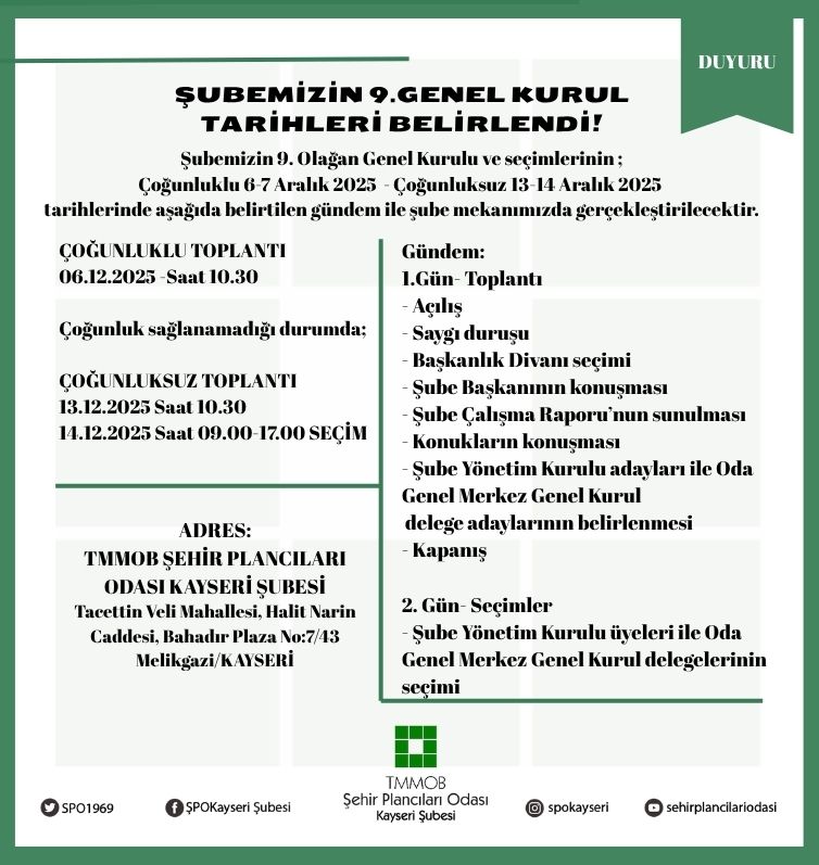 Şubemizin 9. Olağan Genel Kurulu ve seçimlerinin 6-7 Aralık 2025 tarihlerinde çoğunluklu olarak şube mekanımızda (Tacettin Veli Mahallesi, Halit Narin Caddesi, Bahadır Plaza No:7/43 Melikgazi/KAYSERİ); çoğunluk sağlanamaması halinde 13-14 Aralık çoğunluk aranmaksızın şube adresinde (Tacettin Veli Mahallesi, Halit Narin Caddesi, Bahadır Plaza No:7/43 Melikgazi/KAYSERİ) aşağıda verilen gündem ile ;