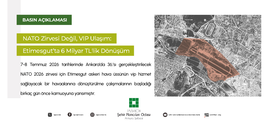 Ankara`da uzun yıllardır kamu kurumlarının kent merkezlerinden uzaklaştırılması süreci ve bu konudaki mücadelelerimiz devam ederken bir taraftan askeri alanlara yönelik de benzer bir süreç yürütülmüştür. Bilindiği gibi 15 Temmuz 2016 darbe girişimi sonrasında askeri alanların kentlerin dışına taşınması gündeme gelmiş ve birçok ilimizde bu hususta adımlar atılmıştır. Ancak öte yandan havaalanlarının yıllar içinde büyüyerek genişleyen kentin merkezi alanlarında konumlanışları, yer seçim kriterleri, ulaşım altyapıları, yakın çevresine ve kente etkileri üzerine detaylı bir çalışma yapmadan mevcut altyapılar çelişkili biçimde genişletilmeye çalışılmaktadır.