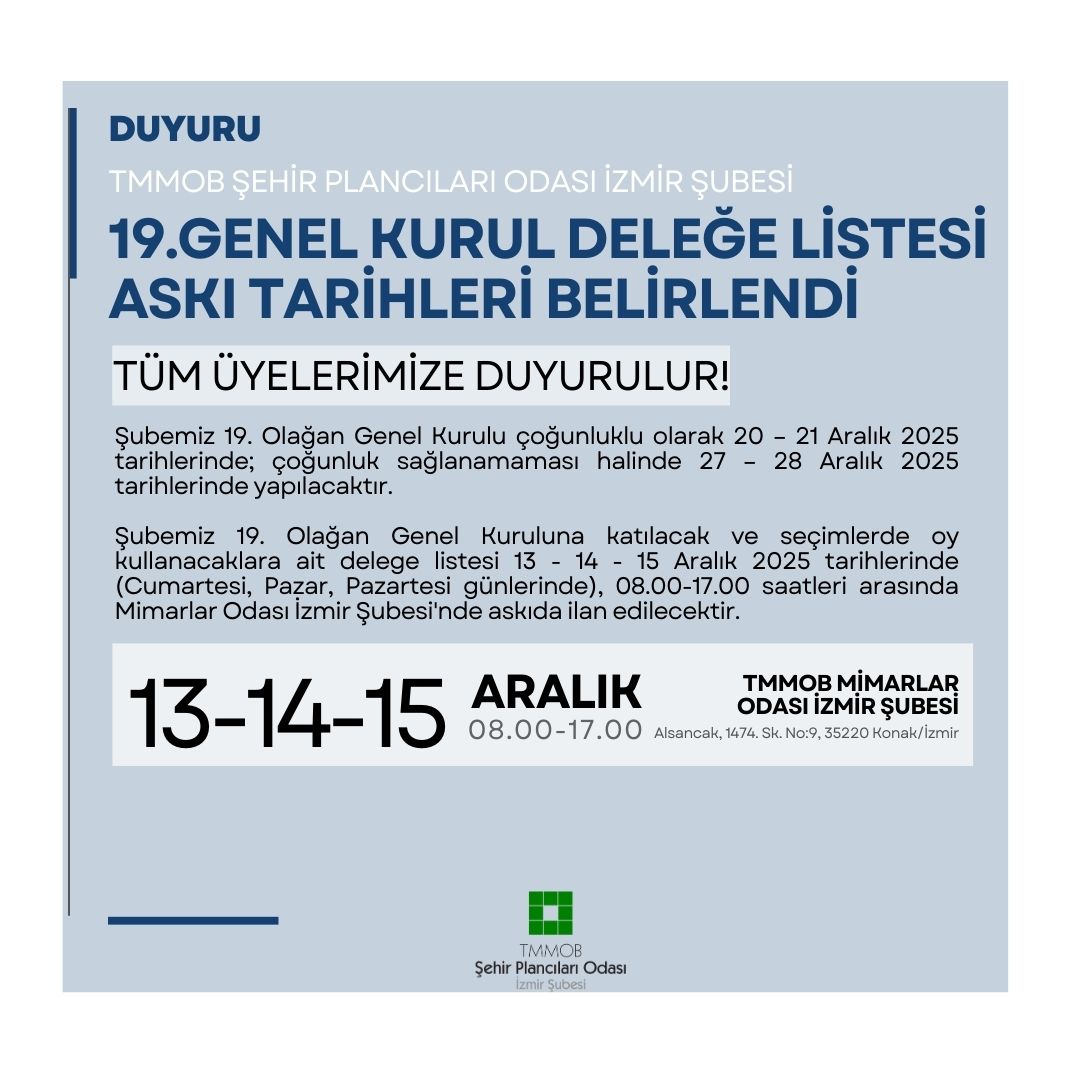 Şubemiz 19. Olağan Genel Kuruluna katılacak ve seçimlerde oy kullanacaklara ait delege listesi 13 - 14 - 15 Aralık 2025 tarihlerinde (Cumartesi, Pazar, Pazartesi günlerinde), 08.00-17.00 saatleri arasında Mimarlar Odası İzmir Şubesi‘nde askıda ilan edilecektir.