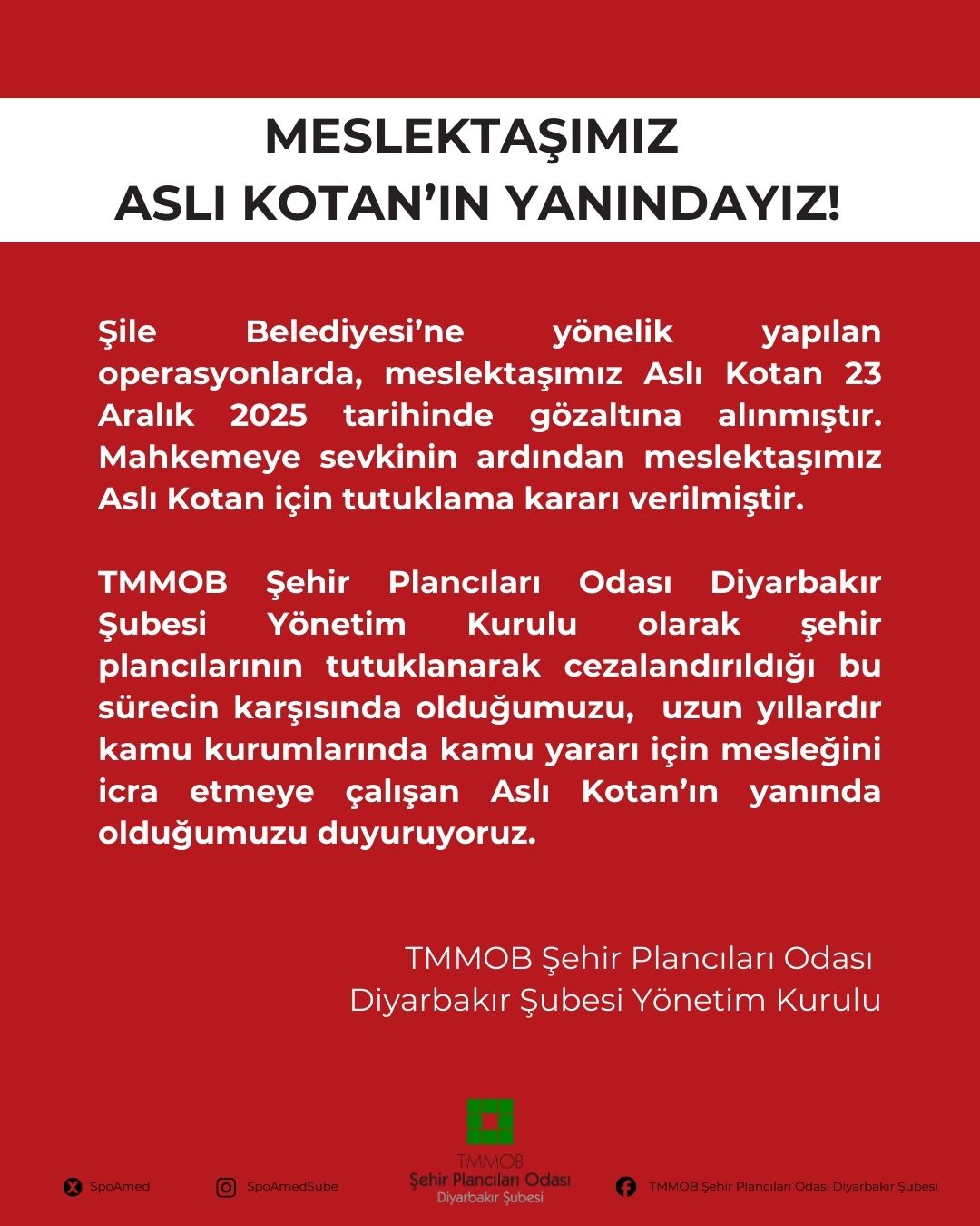 TMMOB Şehir Plancıları Odası Diyarbakır Şubesi Yönetim Kurulu olarak şehir plancılarının tutuklanarak cezalandırıldığı bu sürecin karşısında olduğumuzu, uzun yıllardır kamu kurumlarında kamu yararı için mesleğini icra etmeye çalışan Aslı Kotan`ın yanında olduğumuzu duyuruyoruz.