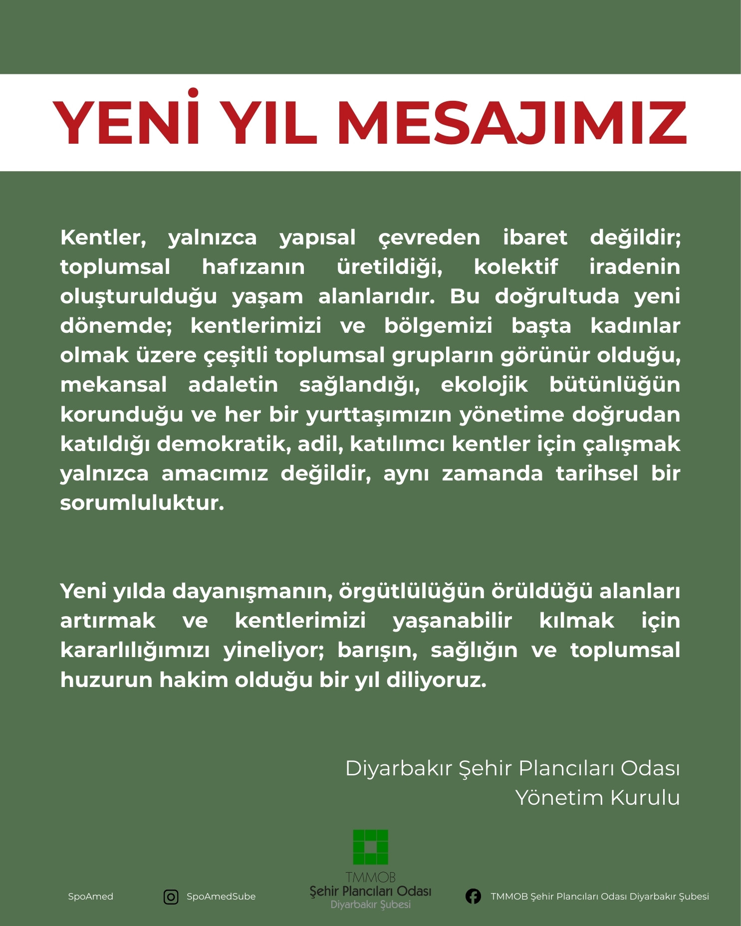 Yeni yılda dayanışmanın, örgütlülüğün örüldüğü alanları artırmak ve kentlerimizi yaşanabilir kılmak için kararlılığımızı yineliyor; barışın, sağlığın ve toplumsal huzurun hakim olduğu bir yıl diliyoruz.