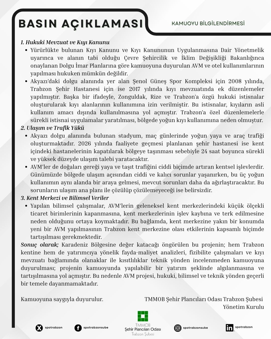 Akyazı dolgu alanında planlanan AVM ve karma kullanım projesinin; yürürlükteki kıyı mevzuatı, kentsel ulaşım altyapısı ve şehir merkezi üzerindeki olası etkilerini şehircilik ilkeleri çerçevesinde kamuoyunun bilgisine sunarız.