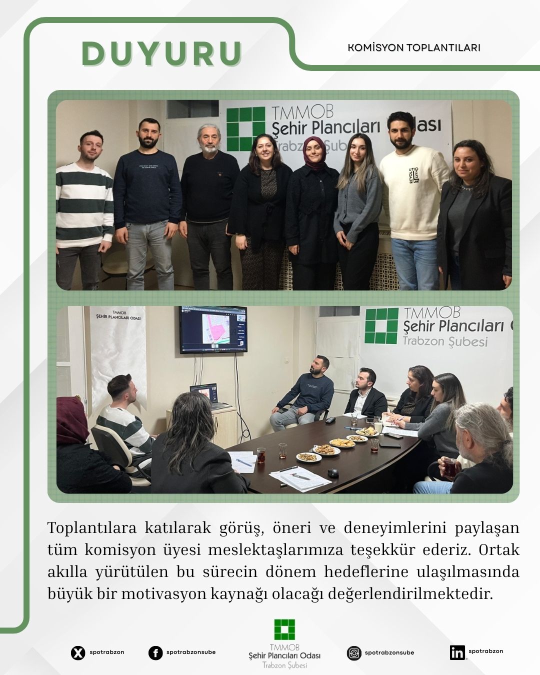 Toplantılara katılarak görüş, öneri ve deneyimlerini paylaşan tüm komisyon üyesi meslektaşlarımıza teşekkür ederiz. Ortak akılla yürütülen bu sürecin, dönem hedeflerine ulaşılmasında büyük bir motivasyon kaynağı olacağı değerlendirilmektedir.