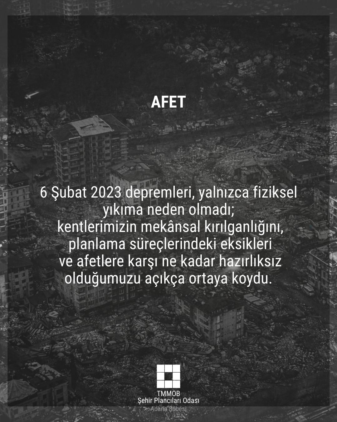 Afet: 6 Şubat 2023 depremleri, yalnızca fiziksel yıkıma neden olmadı; kentlerimizin mekânsal kırılganlığını, planlama süreçlerindeki eksikleri ve afetlere karşı ne kadar hazırlıksız olduğumuzu açıkça ortaya koydu.