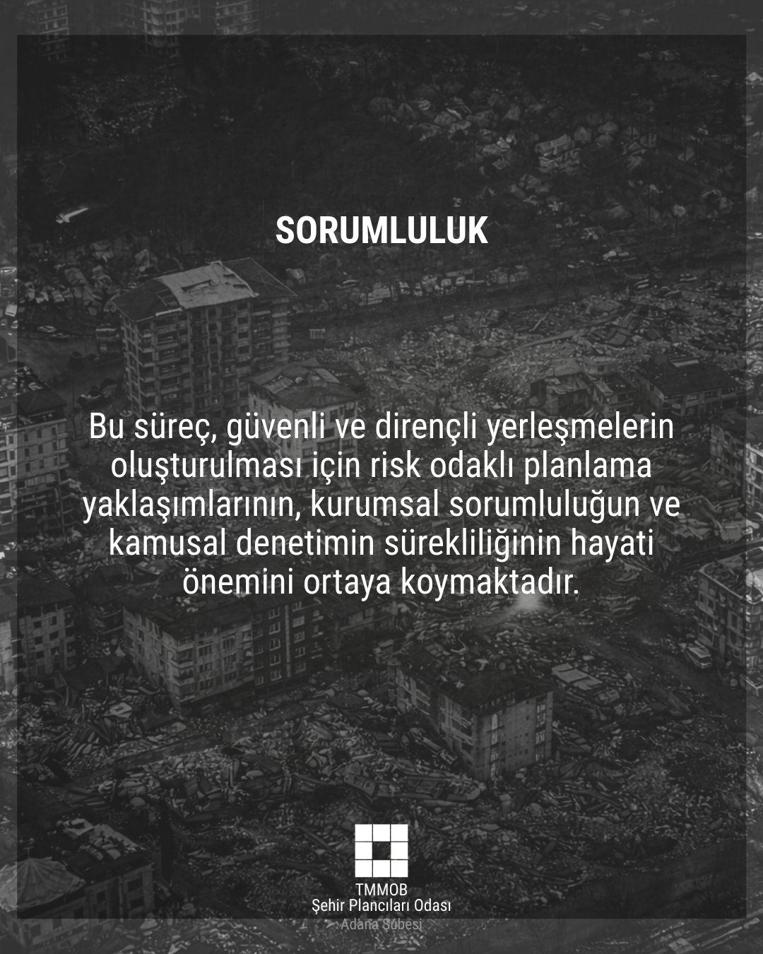 Sorumluluk: Bu süreç, güvenli ve dirençli yerleşmelerin oluşturulması için risk odaklı planlama yaklaşımlarının, kurumsal sorumluluğun ve kamusal denetimin sürekliliğinin hayati önemini ortaya koymaktadır.