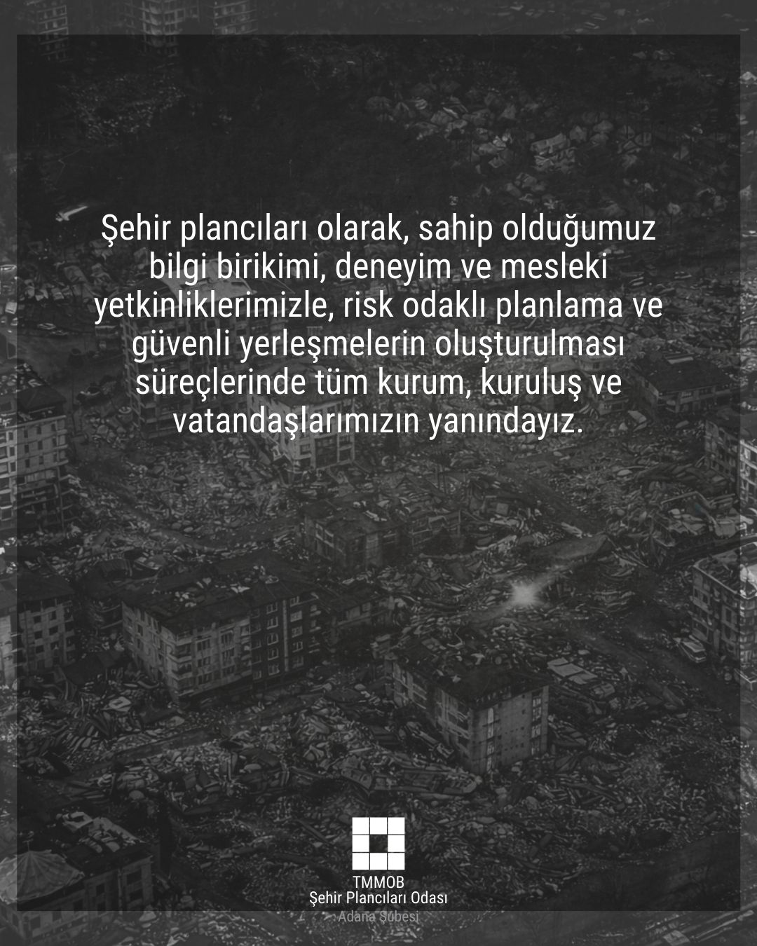 Şehir plancıları olarak, sahip olduğumuz bilgi birikimi, deneyim ve mesleki yetkinliklerimizle, risk odaklı planlama ve güvenli yerleşmelerin oluşturulması süreçlerinde tüm kurum, kuruluş ve vatandaşlarımızın yanındayız.