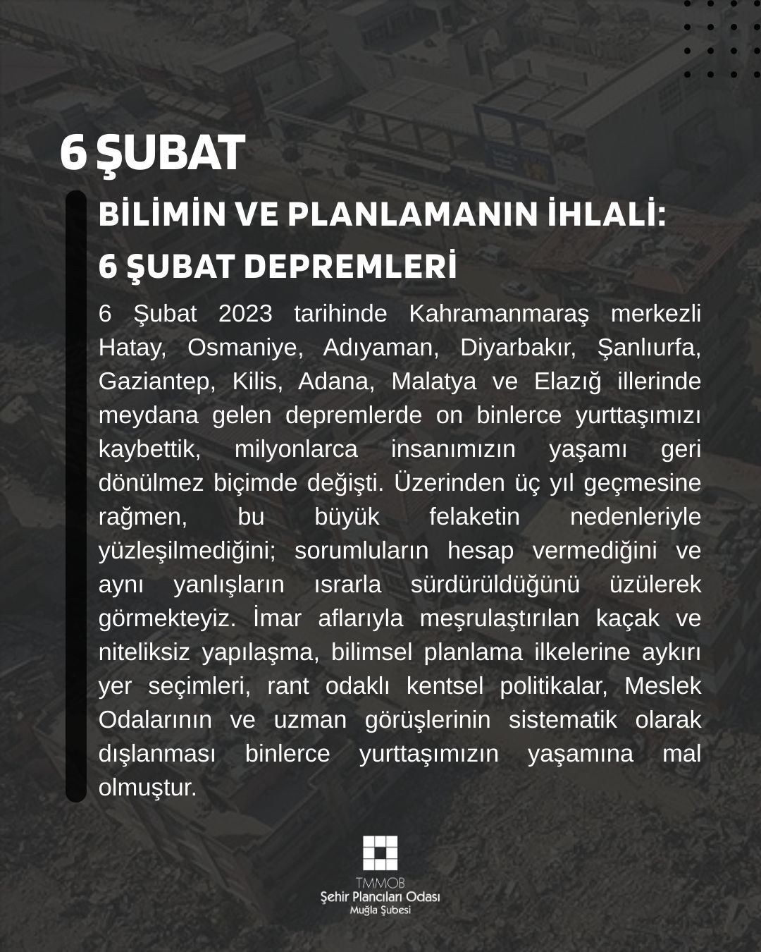 6 Şubat 2023 tarihinde Kahramanmaraş merkezli Hatay, Osmaniye, Adıyaman, Diyarbakır, Şanlıurfa, Gaziantep, Kilis, Adana, Malatya ve Elazığ illerinde meydana gelen depremlerde on binlerce yurttaşımızı kaybettik, milyonlarca insanımızın yaşamı geri dönülmez biçimde değişti. Üzerinden üç yıl geçmesine rağmen, bu büyük felaketin nedenleriyle yüzleşilmediğini; sorumluların hesap vermediğini ve aynı yanlışların ısrarla sürdürüldüğünü üzülerek görmekteyiz. İmar aflarıyla meşrulaştırılan kaçak ve niteliksiz yapılaşma, bilimsel planlama ilkelerine aykırı yer seçimleri, rant odaklı kentsel politikalar, Meslek Odalarının ve uzman görüşlerinin sistematik olarak dışlanması binlerce yurttaşımızın yaşamına mal olmuştur.