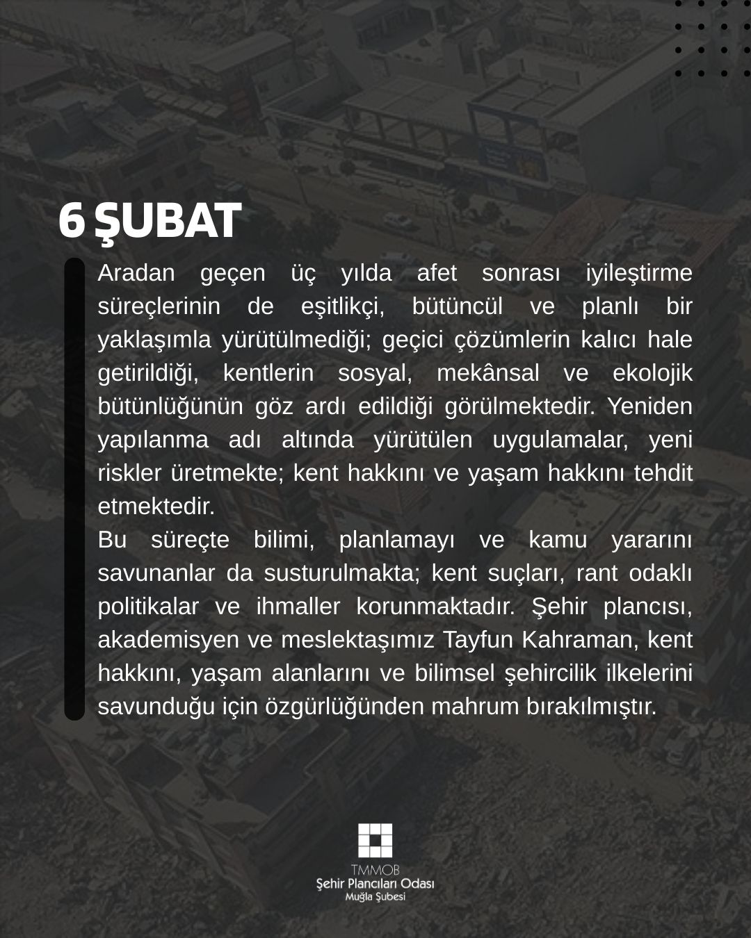 Bu süreçte bilimi, planlamayı ve kamu yararını savunanlar da susturulmakta; kent suçları, rant odaklı politikalar ve ihmaller korunmaktadır. Şehir plancısı, akademisyen ve meslektaşımız Tayfun Kahraman, kent hakkını, yaşam alanlarını ve bilimsel şehircilik ilkelerini savunduğu için özgürlüğünden mahrum bırakılmıştır. Oysa bugün yaşadığımız yıkım, yıllardır dile getirilen bu uyarıların haklılığını acı bir biçimde ortaya koymuştur. Bu sebepledir ki depremde yitirdiğimiz canlar, yalnızca fay hatlarının değil; bilimi susturan, planlamayı devre dışı bırakan anlayışın sorumluluğundadır.
