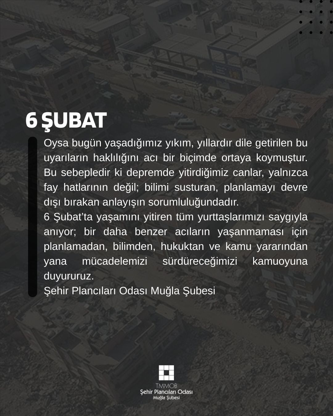 6 Şubat`ta yaşamını yitiren tüm yurttaşlarımızı saygıyla anıyor; bir daha benzer acıların yaşanmaması için planlamadan, bilimden, hukuktan ve kamu yararından yana mücadelemizi sürdüreceğimizi kamuoyuna duyururuz.