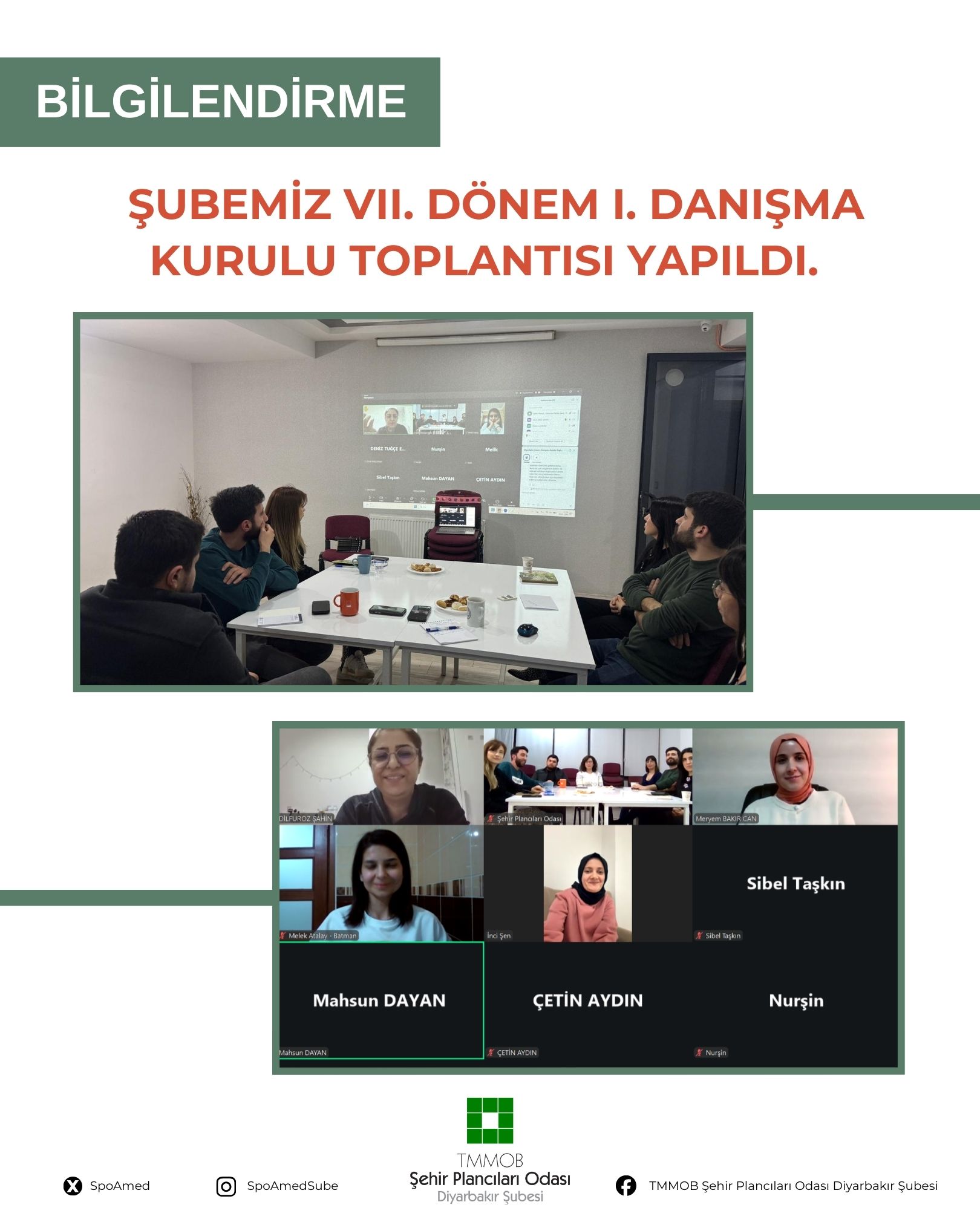 TMMOB Şehir Plancıları Odası Diyarbakır Şubesi VII. Dönem I. Danışma Kurulu Toplantısı yapıldı. Toplantıda, 27-28-29 Mart 2026 tarihinde planlanan Genel Kurula sunulacak önergeler için meslektaşlarımızın çeşitli konulardaki görüş ve önerileri tartışılmıştır.