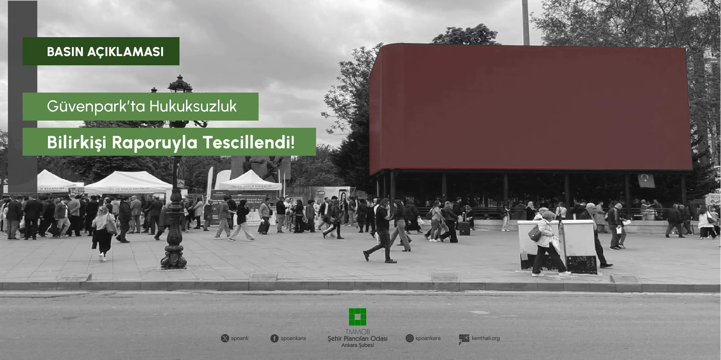 Güvenpark`ın tarihsel  ve mekânsal bütünlüğü ile kamusal niteliği herhangi bir idari tasarrufa ya da geçici gerekçeye feda edilemez. Bu itibarla, ABB`yi, nihai mahkeme kararını beklemeksizin, kamu sorumluluğu bilinciyle hareket etmeye ve sit alanındaki bu hukuksuz uygulamayı derhal sonlandırarak panoyu kaldırmaya davet ediyoruz. Kentimizin planlama mirasını ve kültürel değerlerini koruma sorumluluğumuz gereği, hukuka ve bilimsel ilkelere aykırı bu uygulamaya karşı mücadelemizi kararlılıkla sürdüreceğimizi kamuoyuna saygıyla duyururuz.