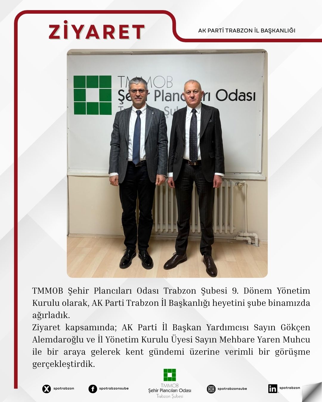Nazik ziyaretleri ve Trabzon`un şehircilik vizyonuna dair gösterdikleri ilgi için Sayın Alemdaroğlu`na ve Sayın Muhcu`ya teşekkür ederiz. Mesleki sorumluluğumuz gereği, kentimiz için üretilen tüm süreçlerde teknik görüşlerimizi paylaşmaya ve diyalog kanallarını açık tutmaya devam edeceğiz.