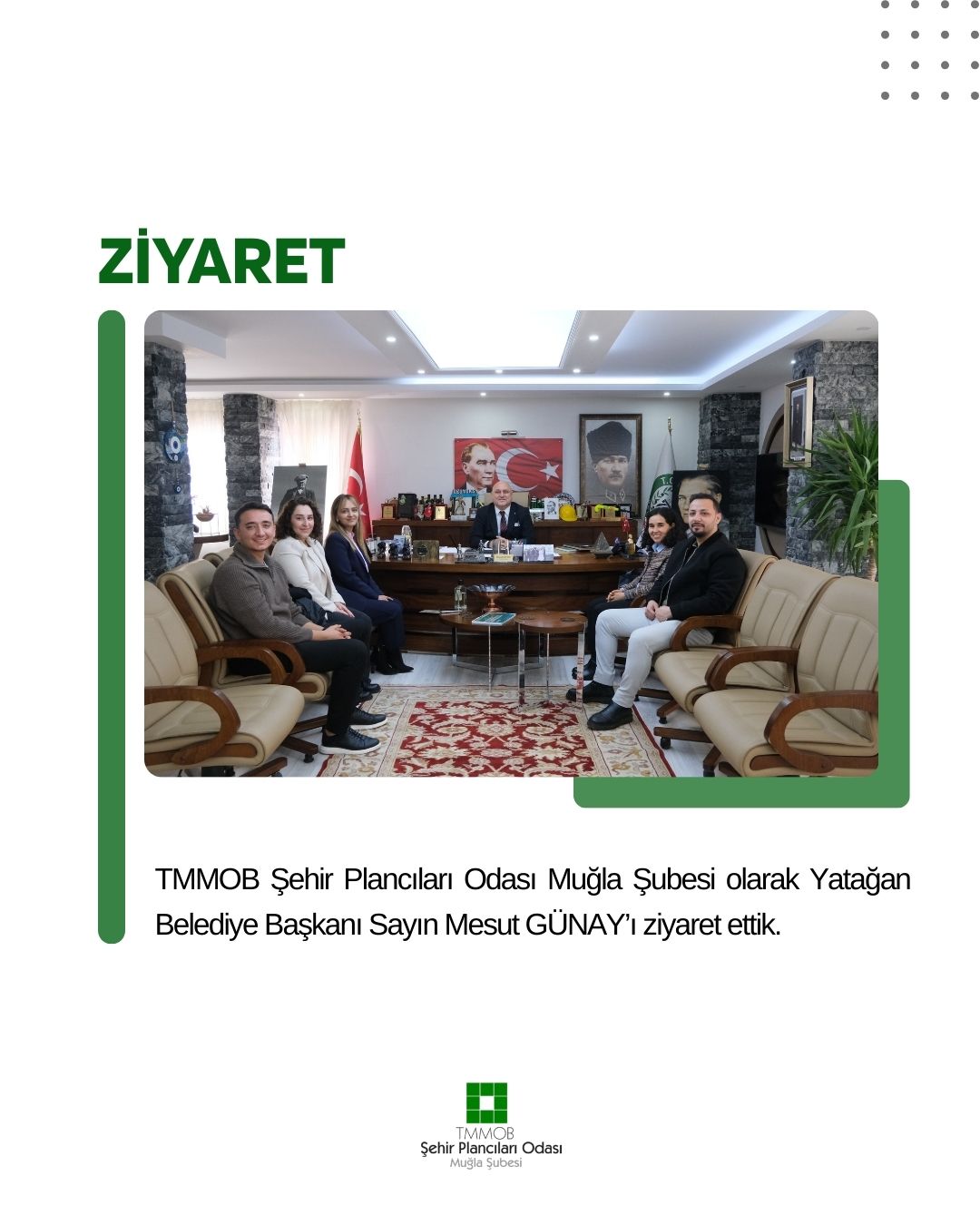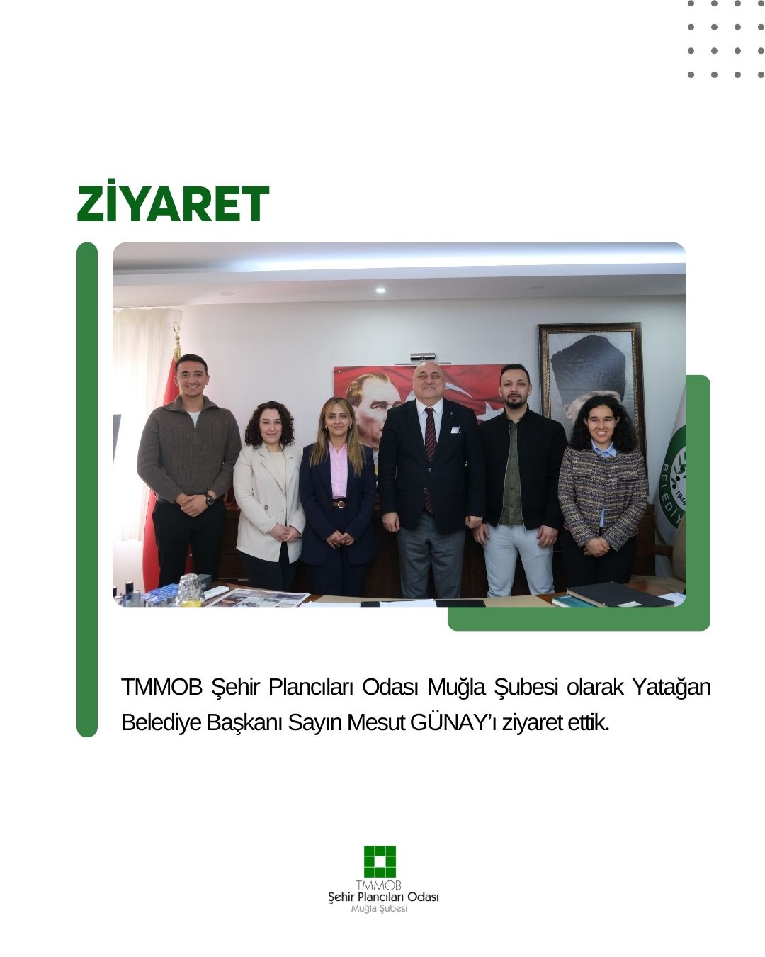 TMMOB Şehir Plancıları Odası Muğla Şubesi olarak Yatağan Belediye Başkanı Sayın Mesut GÜNAY ile bir araya geldik. Ziyaretimizde Yatağan ilçesindeki üst ölçek plan çalışmaları, planlamaya yönelik uygulama süreçlerindeki problemler ve çözümleri üzerine fikir alışverişinde bulunduk.İlçe Belediyeleri ile meslek odalarının işbirliği ve ortak çalışmalar üzerinde istişarelerde bulunduk. Görev süremiz boyunca meslek odamız ile kurulacak diyalog süreçleri ve devamlılığının olması gerektiği konusunda hemfikir olduk.