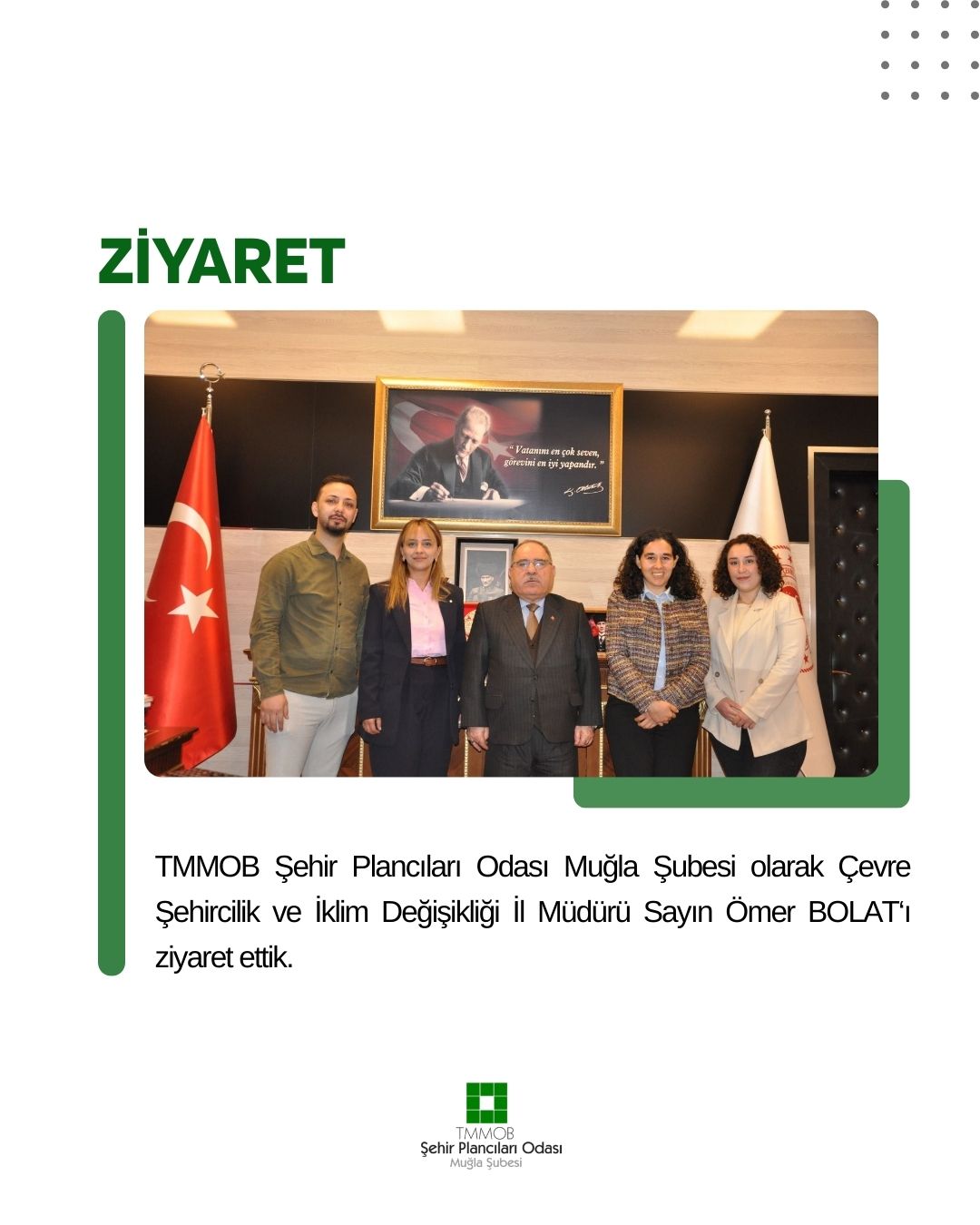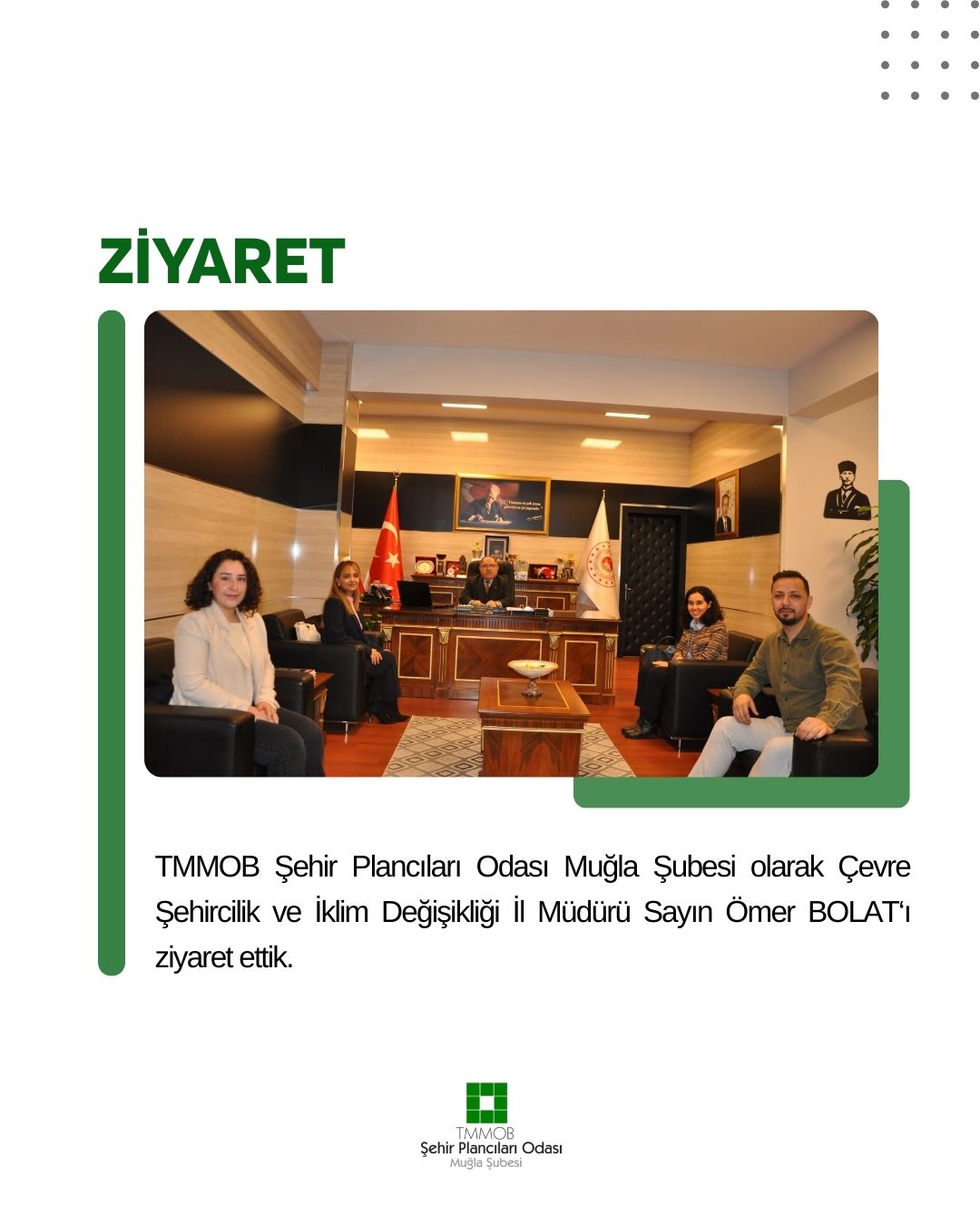 TMMOB Şehir Plancıları Odası Muğla Şubesi olarak Çevre Şehircilik ve İklim Değişikliği İl Müdürü Sayın Ömer BOLAT ile bir araya geldik. Ziyaretimizde Muğla`daki Özel Çevre Koruma Bölgelerindeki, Korunan Alanlardaki planlama çalışmaları, güncel mevzuat ve uygulama süreçleri üzerine fikir alışverişinde bulunduk. İl Müdürlüğü ile meslek odalarının işbirliği ve ortak çalışmalar üzerinde istişarelerde bulunduk. Görev süremiz boyunca meslek odamız ile kurulacak diyalog süreçleri ve devamlılığının olması gerektiği konusunda hemfikir olduk.