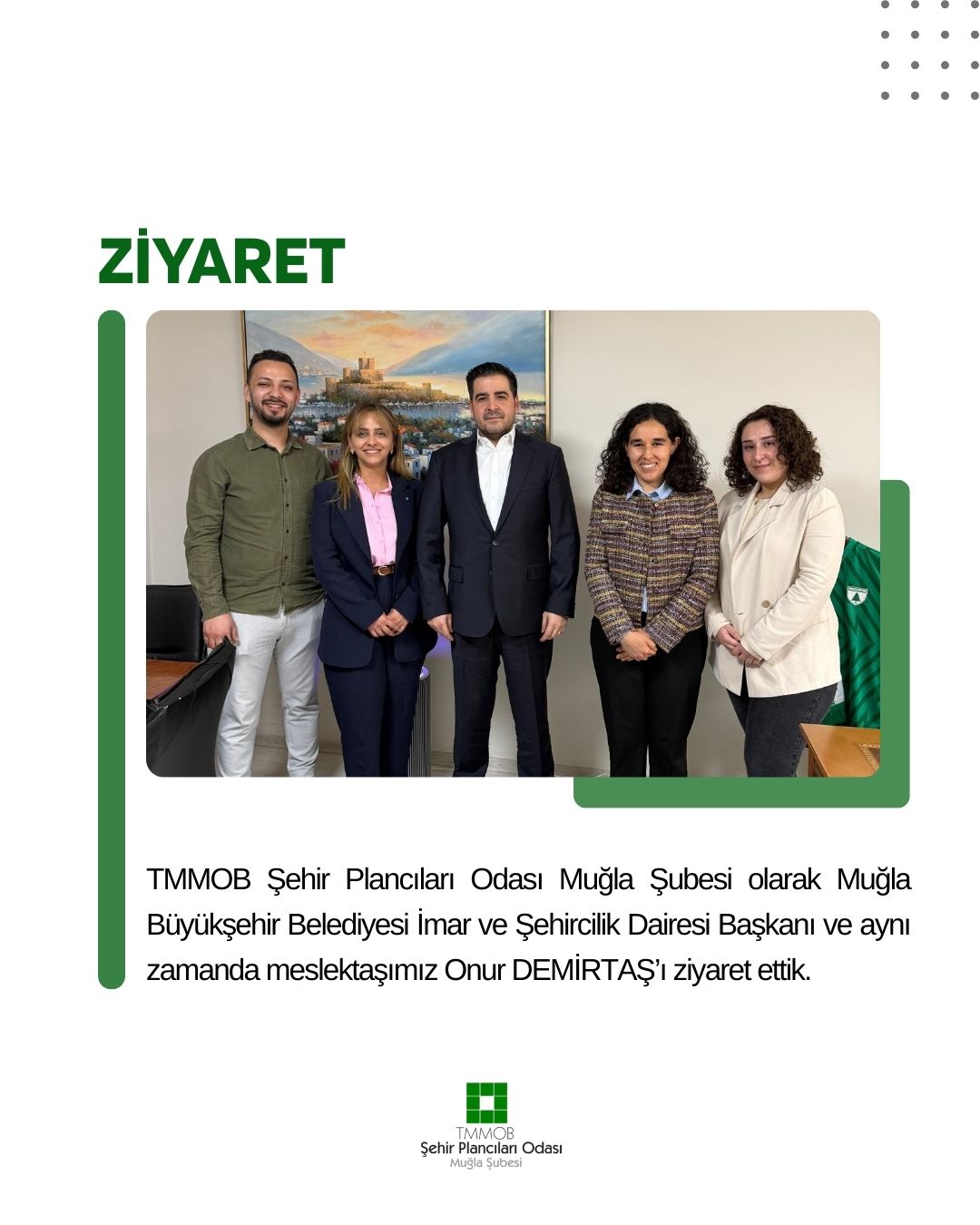 TMMOB Şehir Plancıları Odası Muğla Şubesi olarak Muğla Büyükşehir Belediyesi İmar ve Şehircilik Dairesi Başkanı ve aynı zamanda meslektaşımız Onur DEMİRTAŞ ile bir araya geldik. Ziyaretimizde Muğla İl geneli üst ölçek plan çalışmaları, planlama süreçlerinde meslek odamızın katılımı planlamaya yönelik il bütününde karşılaştığımız problemler ve çözümleri üzerine fikir alışverişinde bulunduk. Büyükşehir Belediyesi ile meslek odalarının işbirliği ve ortak çalışmalar üzerinde istişarelerde bulunduk.