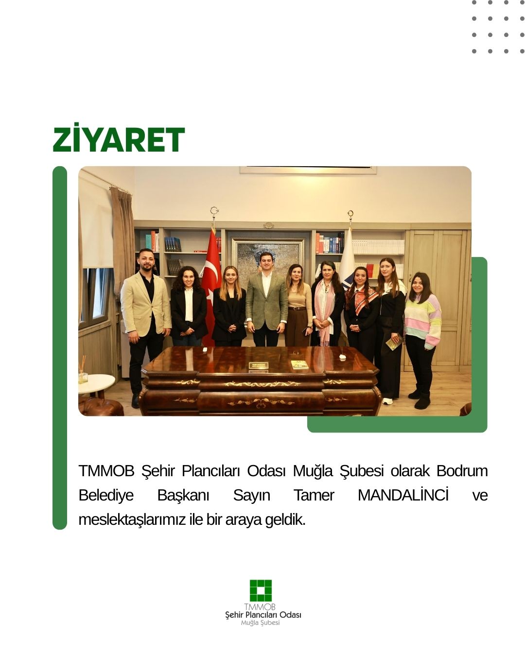 TMMOB Şehir Plancıları Odası Muğla Şubesi olarak Bodrum Belediyesi Başkanı Sayın Tamer MANDALİNCİ ve meslektaşlarımız ile bir araya geldik. Ziyaretimizde Bodrum özelinde yürütülen bütüncül planlama çalışmaları, Rezerv Alan ilan edilen bölgelerdeki ortak mücadelemiz, planlama süreçlerinde meslek odamızın katılımı, yerel yönetimlerdeki meslektaşlarımızın istihdamı, planlamaya yönelik uygulamadaki problemler ve çözümleri üzerine fikir alışverişinde bulunduk. Yerel yönetimler ile meslek odalarının işbirliği ve ortak çalışmalar üzerinde istişarelerde bulunduk. Sayın Tamer MANDALİNCİ‘ye ve meslektaşlarımıza nazik misafirperverlikleri için teşekkür ederiz.