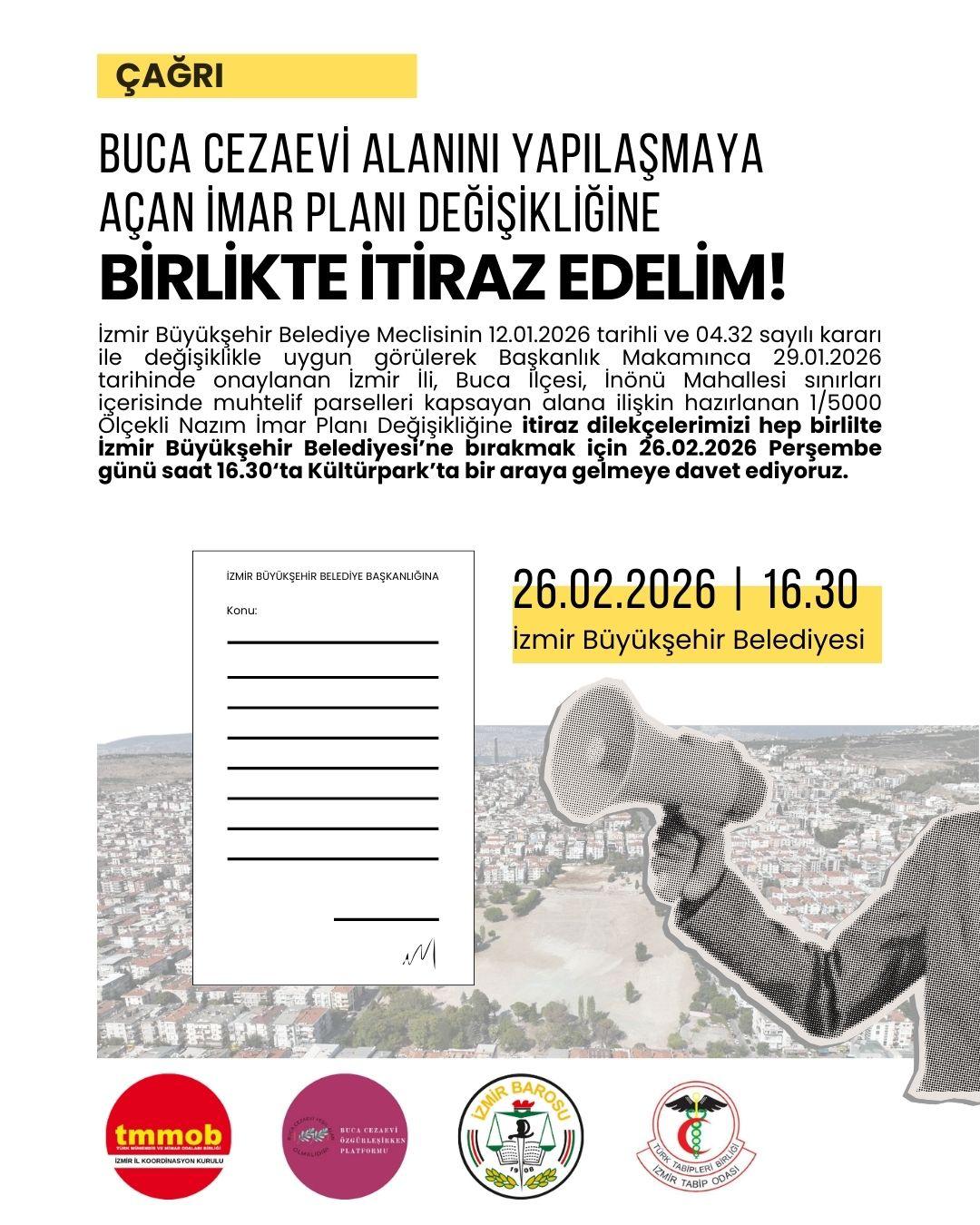 İzmir Büyükşehir Belediye Meclisinin 12.01.2026 tarihli ve 04.32 sayılı kararı ile değişiklikle uygun görülerek Başkanlık Makamınca 29.01.2026 tarihinde onaylanan İzmir İli, Buca İlçesi, İnönü Mahallesi sınırları içerisinde muhtelif parselleri kapsayan alana ilişkin hazırlanan 1/5000 Ölçekli Nazım İmar Planı Değişikliğine itiraz dilekçelerimizi hep birlilte İzmir Büyükşehir Belediyesi`ne bırakmak için 26.02.2026 Perşembe günü saat 16.30‘ta Kültürpark`ta bir araya gelmeye davet ediyoruz.