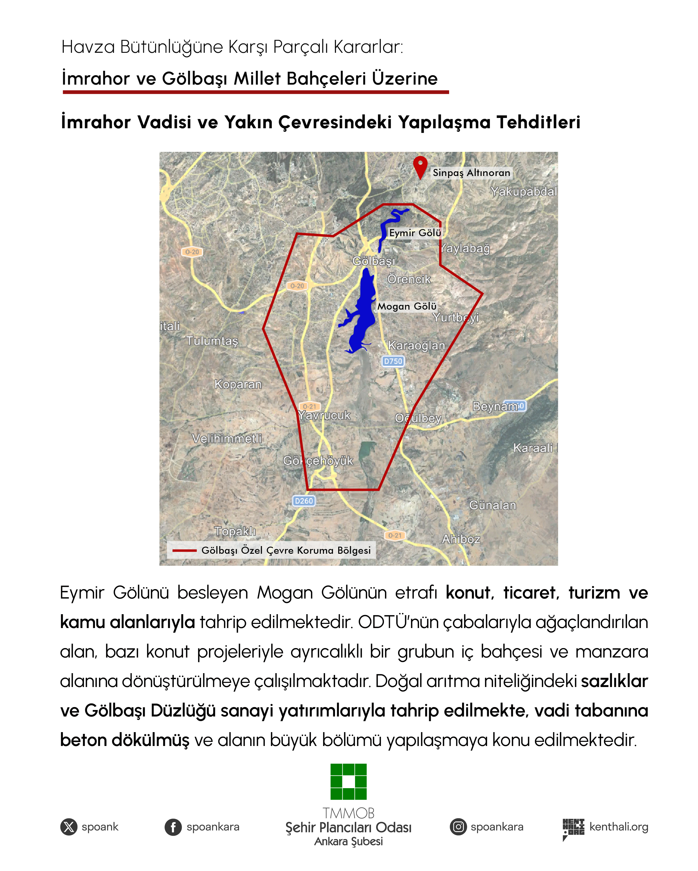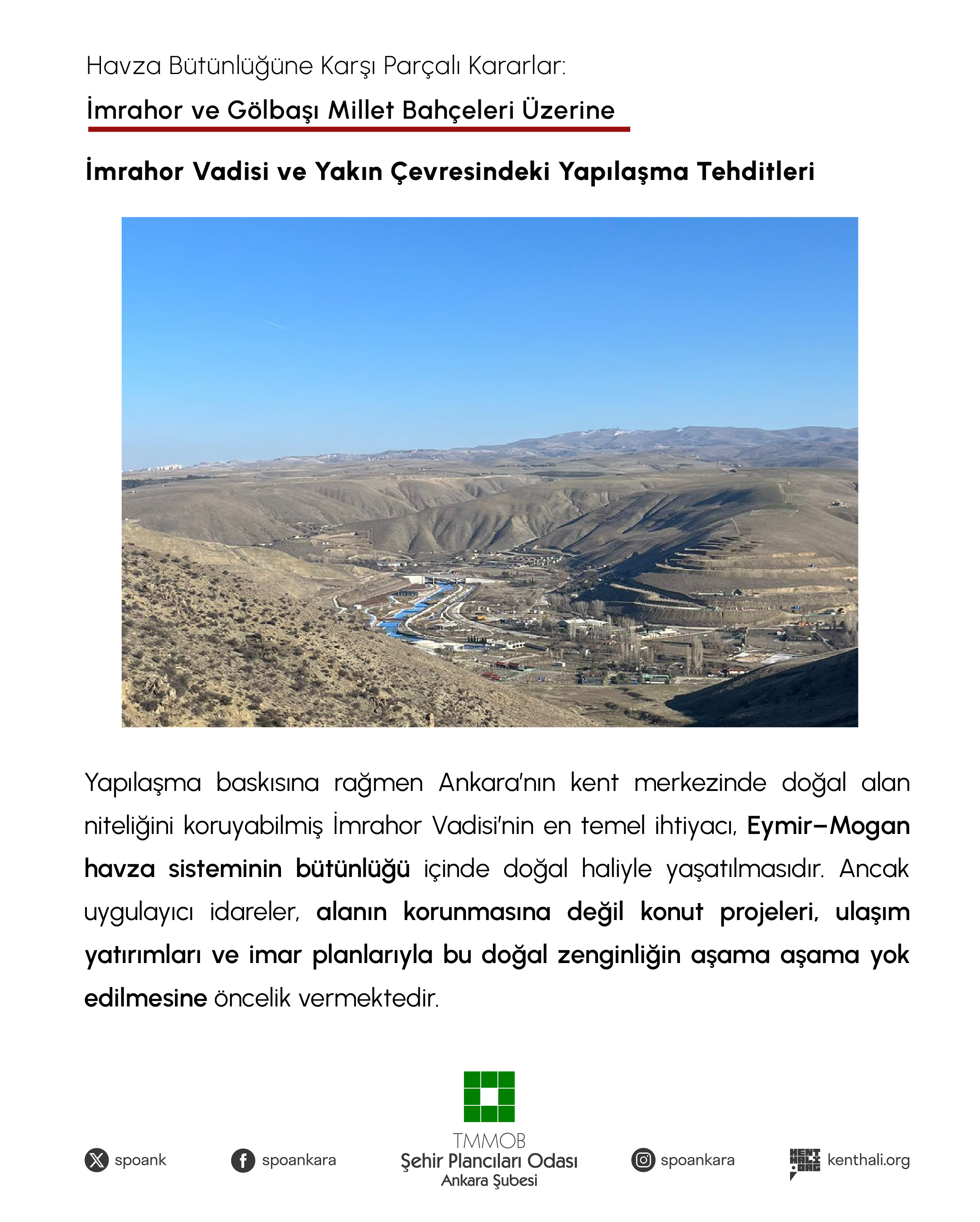 Yapılaşma baskısına rağmen Ankara`nın kent merkezinde doğal alan niteliğini büyük ölçüde koruyabilmiş İmrahor Vadisi`nin en temel ihtiyacı Eymir-Mogan Gölleri Havza sisteminin bütünlüğü içinde vadi alanının doğal haliyle yaşatılmasıdır. Ancak yerel yönetiminden merkezi yönetimine kadar uygulayıcı idareler maalesef alanın korunarak yaşatılmasına değil lüks konut projeleriyle, yeni ulaşım yatırımlarıyla, mahkeme kararlarının iptal gerekçelerini dikkate alarak hazırlanmayan imar planlarıyla bu doğal zenginliğin aşama aşama yok edilmesine öncelik vermektedir.