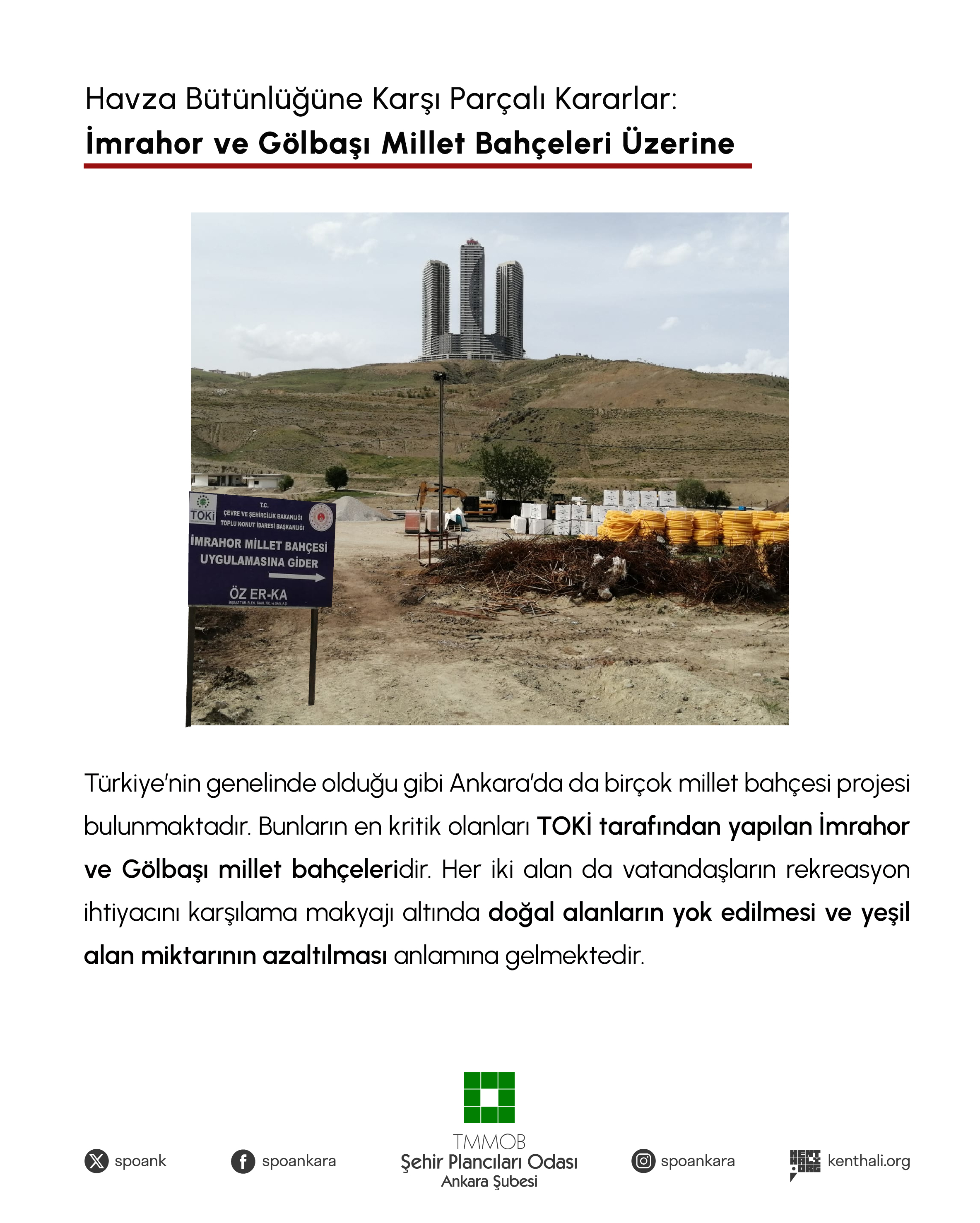 Türkiye‘nin genelinde olduğu gibi Ankara`da da birçok millet bahçesi projesi bulunmaktadır. Bunların en kritik olanları TOKİ tarafından yapılan İmrahor ve Gölbaşı Millet Bahçeleridir. Her iki alan da diğer millet bahçeleri örneklerinde görülebileceği üzere vatandaşların rekreasyon ihtiyacını karşılama makyajı altında aslında doğal alanların yok edilmesi ve yeşil alan miktarının azaltılması anlamına gelmektedir. Örneğin İmrahor Millet Bahçesi alanında 188 bin 203 metrekarelik proje alanında 135 araçlık otopark, kafeteryalar, mescit, millet kıraathanesi, büfeler, elektronik oyun alanları ve fitness sahaları gibi hizmetler bulunmaktadır Ayrıca 2019 yılındaki değişiklikle millet bahçesi kavramının alelacele Planlı Alanlar İmar Yönetmeliğine tanımının madde olarak eklenmesi, ortada hiçbir plan yokken Bakanlığın yayımladığı millet bahçeleri rehberi üzerinden Türkiye`nin birçok farklı yerinde uygulamaya geçilmesi ve ardından apar topar planların yapılması meslek alanımızı yok saymaktan başka bir anlam taşımamaktadır. Tıpkı 6 Şubat depremlerinin ardından 126 sayılı Cumhurbaşkanlığı kararnamesiyle planlama meslek alanını devre dışı bırakmak amacıyla vaziyet planları üzerinden kentleri dizayn etmeye çalışan AKP`nin şehircilik anlayışı gibi millet bahçesi projeleriyle de benzer şekilde kentlerin son nefes alma alanları da yok edilmektedir.