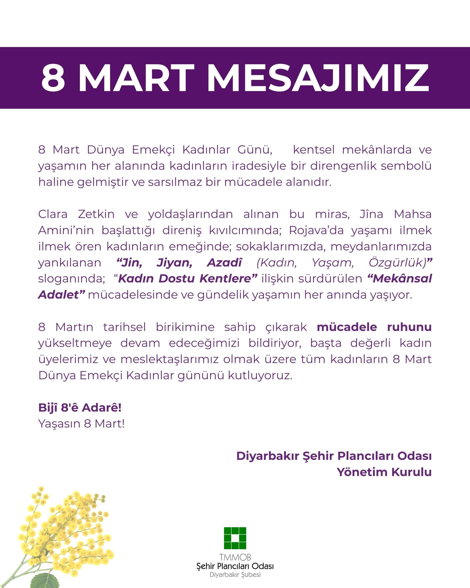 8 Mart Dünya Emekçi Kadınlar Günü, kentsel mekânlarda ve yaşamın her alanında kadınların iradesiyle bir direngenlik sembolü haline gelmiştir ve sarsılmaz bir mücadele alanıdır.