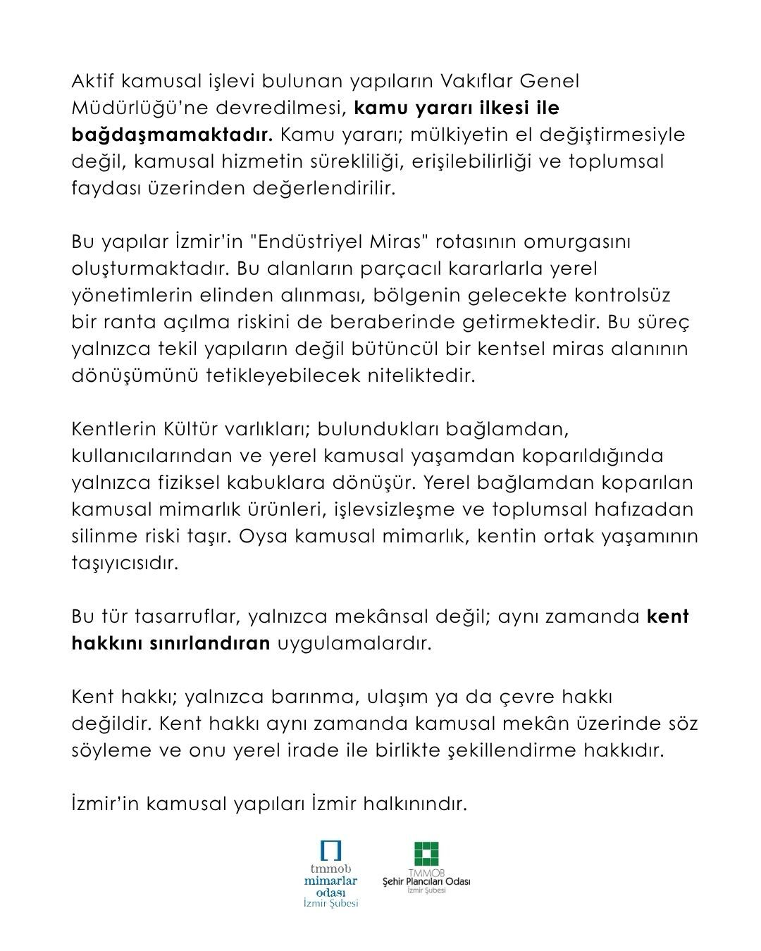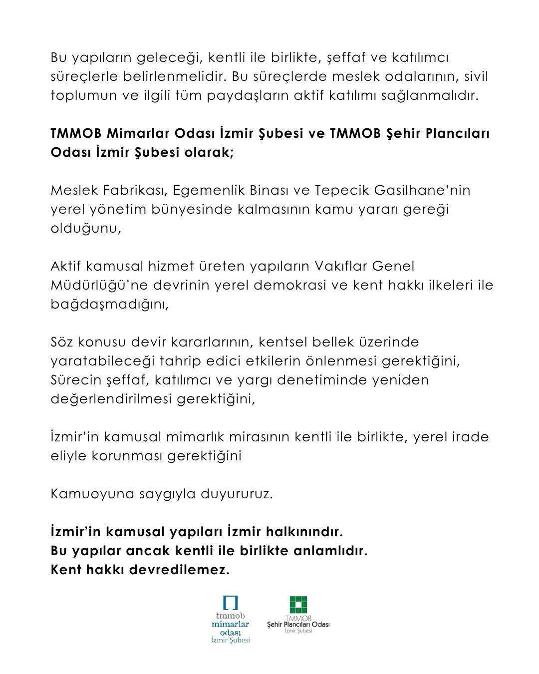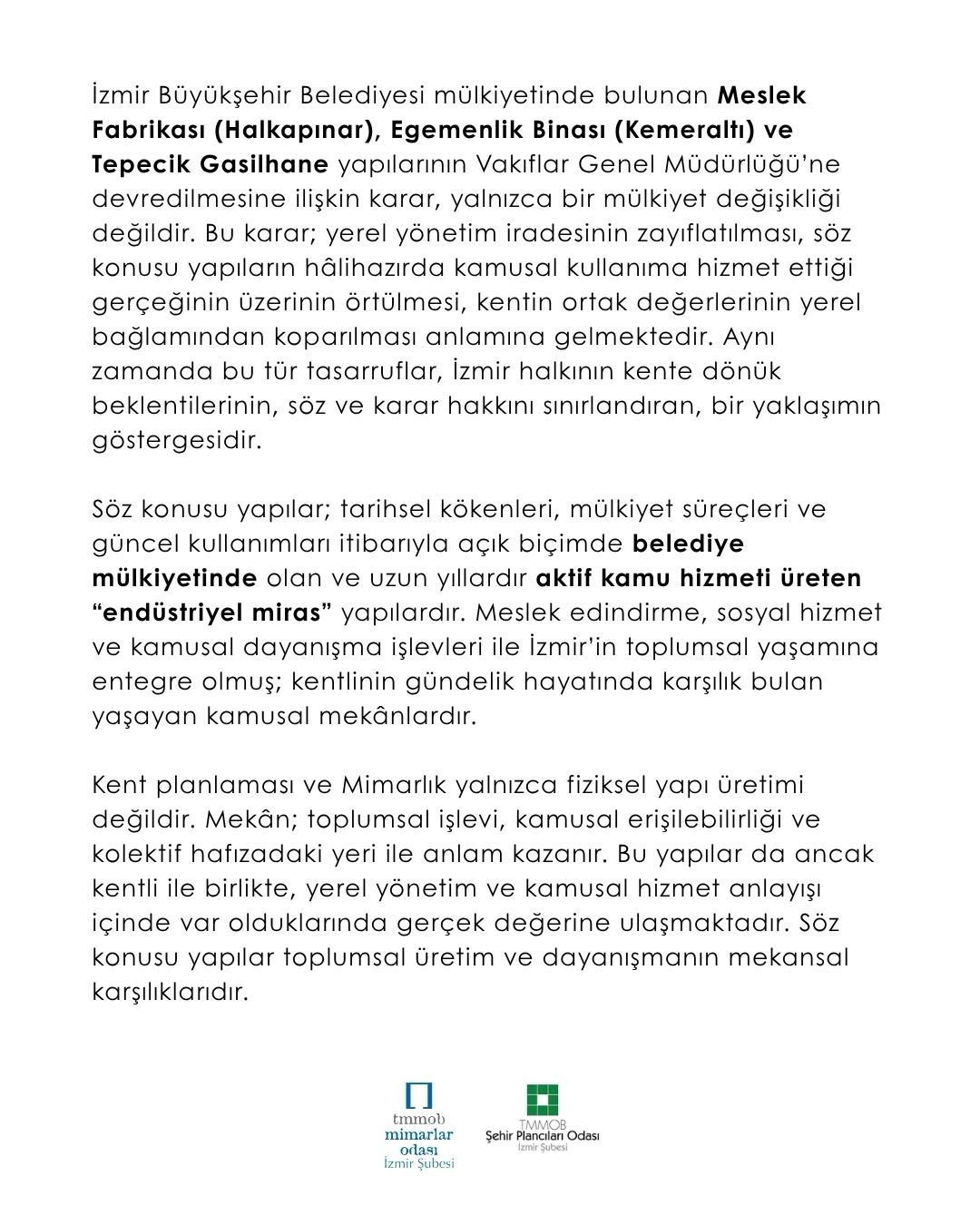 İzmir Büyükşehir Belediyesi taşınmazlarına ilişkin yürütülen sürece dair: TMMOB Mimarlar Odası İzmir Şubesi ve TMMOB Şehir Plancıları Odası İzmir Şubesi olarak;