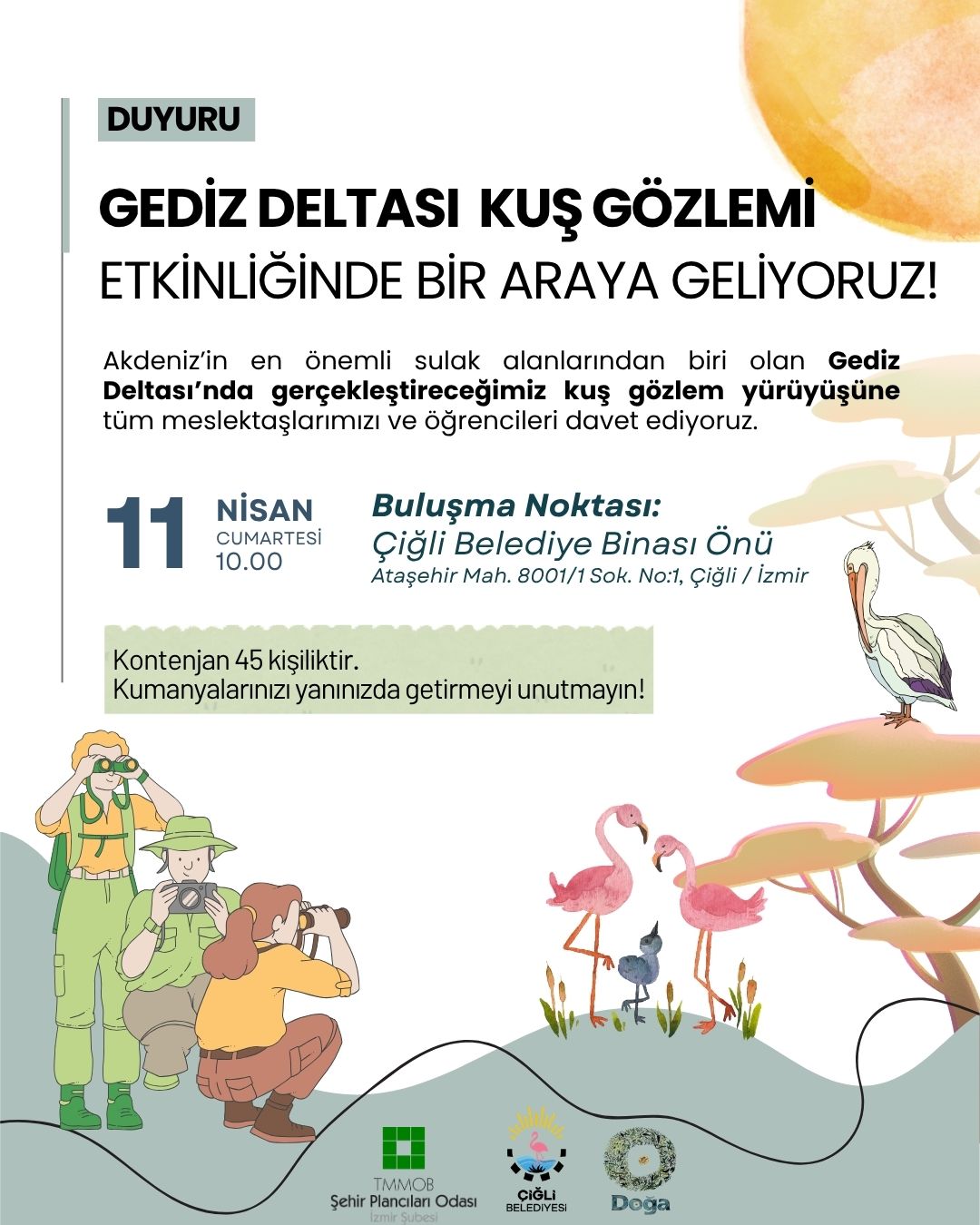 TMMOB Şehir Plancıları Odası İzmir Şubesi olarak, Doğa Derneği ve Çiğli Belediyesi iş birliğiyle, Akdeniz`in en önemli sulak alanlarından biri olan Gediz Deltası`nda gerçekleştireceğimiz kuş gözlem yürüyüşüne tüm meslektaşlarımızı ve öğrencileri davet ediyoruz.