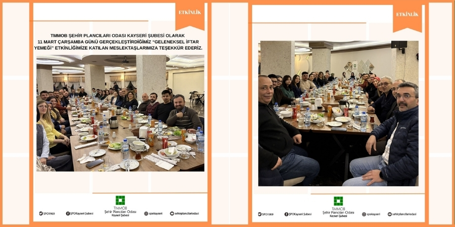 TMMOB Şehir Plancıları Odası Kayseri Şubesi olarak 11 Mart çarşamba günü gerçekleştirdiğimiz "Geleneksel İftar Yemeği" etkinliğimize katılan meslektaşlarımıza teşekkür ederiz.💐