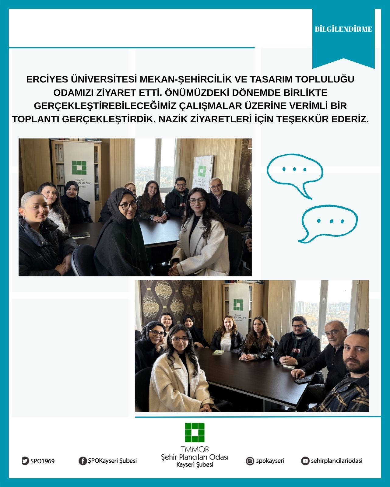 Erciyes Üniversitesi Mekan-Şehircilik ve Tasarım Topluluğu odamızı ziyaret etti. Önümüzdeki dönemde birlikte gerçekleştirebileceğimiz çalışmalar üzerine verimli bir toplantı gerçekleştirdik. Nazik ziyaretleri için teşekkür ederiz.🌿