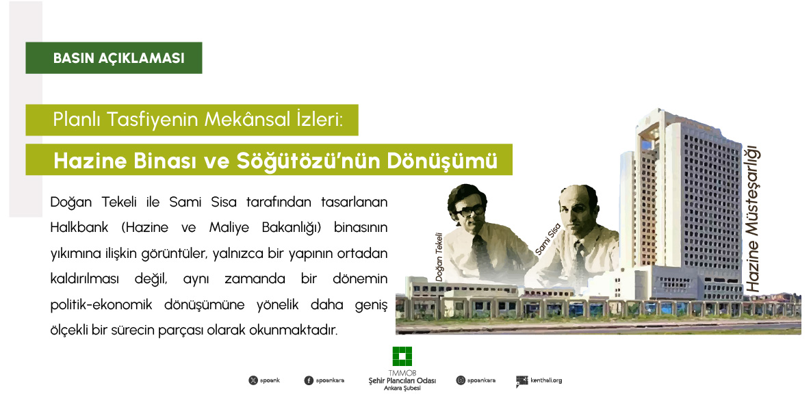 Doğan Tekeli ve Sami Sisa tarafından tasarlanan Halkbank (Hazine ve Maliye Bakanlığı) binasının yıkım süreci, yalnızca bir yapının fiziksel kaybını değil, aynı zamanda Ankara`nın modern mimarlık mirasının ve bir dönemin sosyo-ekonomik izlerinin silinmesini temsil etmektedir. Turgut Özal dönemiyle başlayan neoliberal dönüşümün mekânsal bir yansıması olan bu yapı; başlangıçta üretimi ve sanayiciyi destekleyen kamusal finansın simgesiyken, zaman içinde Hazine Müsteşarlığı`na devredilerek sermayenin merkezileşen yönetim mantığına eklemlenmiştir.