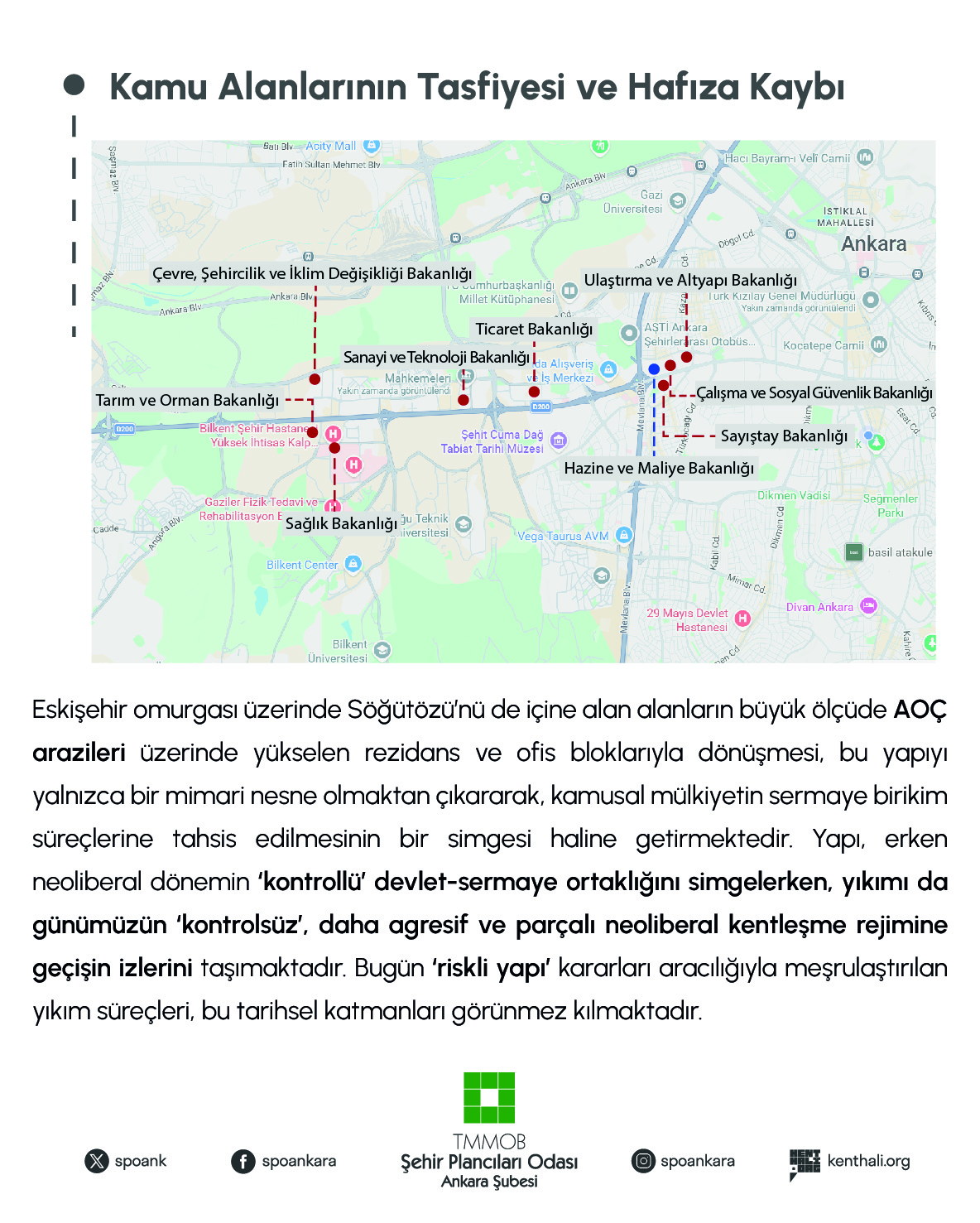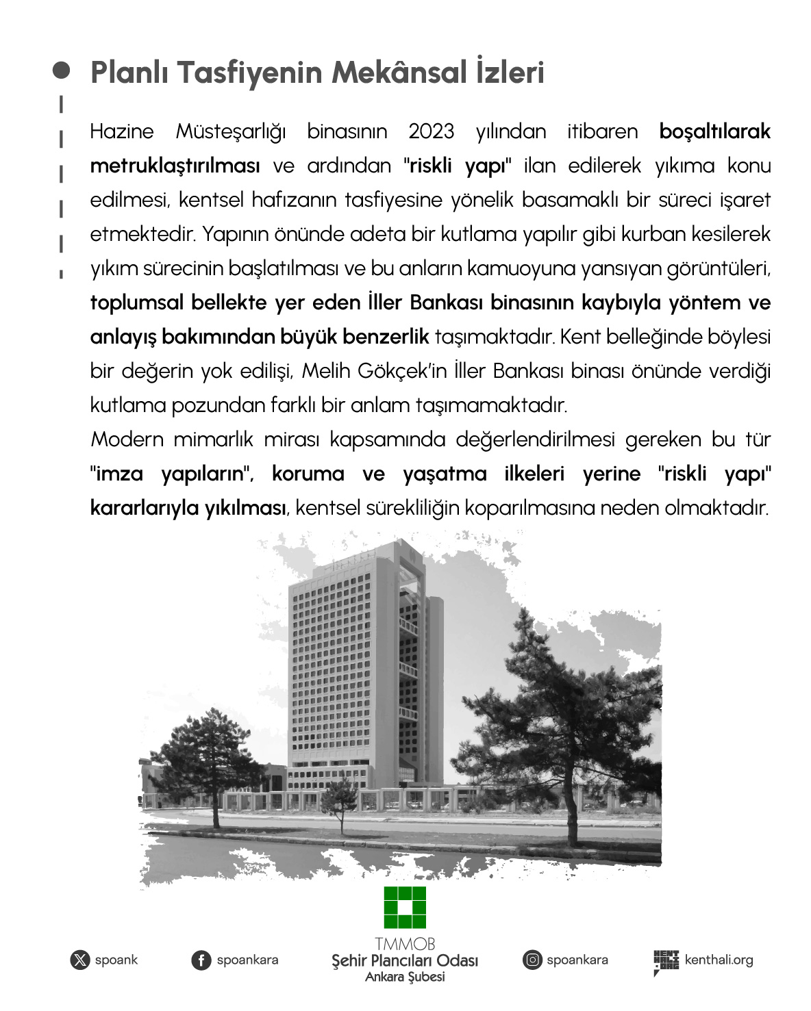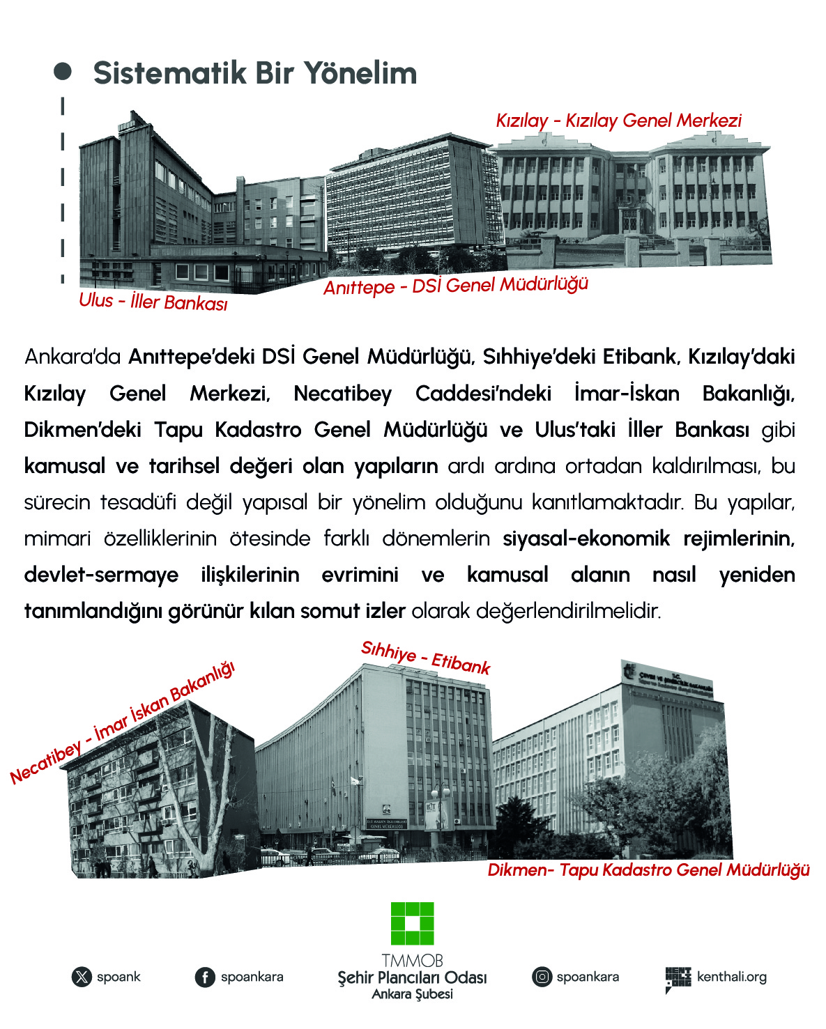 Ankara`da Anıttepe`deki DSİ Genel Müdürlüğü, Sıhhiye`deki Etibank, Kızılay`daki Kızılay Genel Merkezi, Necatibey Caddesi`ndeki İmar-İskan Bakanlığı, Dikmen`deki Tapu Kadastro Genel Müdürlüğü ve Ulus`taki İller Bankası gibi kamusal ve tarihsel değeri olan yapıların ardı ardına ortadan kaldırılması, bu sürecin tesadüfi değil yapısal bir yönelim olduğunu kanıtlamaktadır. Söz konusu yıkımlar kentin karşı-bellek üretme kapasitesini de ortadan kaldırmaktadır. Bu yapılar, mimari özelliklerinin ötesinde farklı dönemlerin siyasal-ekonomik rejimlerinin, devlet-sermaye ilişkilerinin evrimini ve kamusal alanın nasıl yeniden tanımlandığını görünür kılan somut izler olarak değerlendirilmelidir. Sonuç olarak bu yıkım süreci, inşaat sektörünün lokomotif olduğu, özelleştirmelerin ve mülksüzleştirmenin hızlandığı neoliberal bir kentleşme evresine geçişin mekânsal ilanıdır.