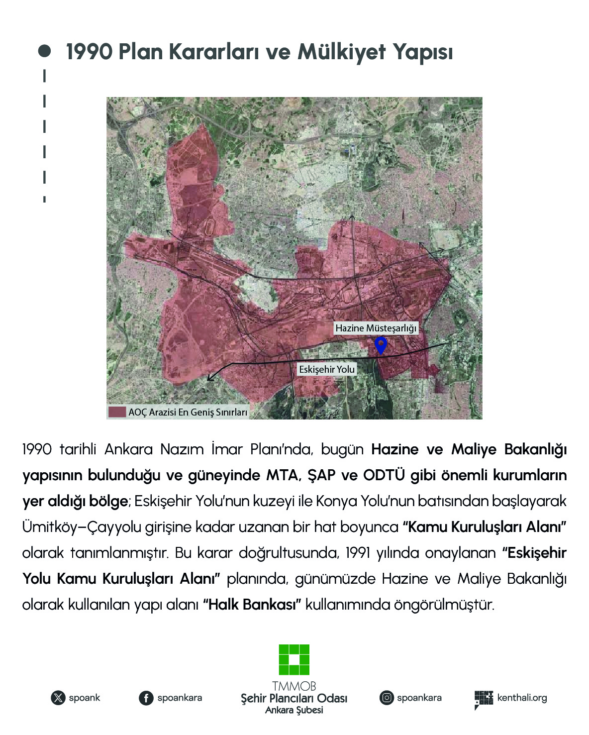 1990 tarihli Ankara Nazım İmar Planı`nda, bugün Hazine ve Maliye Bakanlığı yapısının bulunduğu ve güneyinde MTA, ŞAP ve ODTÜ gibi önemli kurumların yer aldığı bölge; Eskişehir Yolu`nun kuzeyi ile Konya Yolu`nun batısından başlayarak Ümitköy–Çayyolu girişine kadar uzanan bir hat boyunca "Kamu Kuruluşları Alanı" olarak tanımlanmıştır. Bu karar doğrultusunda, 1991 yılında onaylanan "Eskişehir Yolu Kamu Kuruluşları Alanı" planında, günümüzde Hazine ve Maliye Bakanlığı olarak kullanılan yapı alanı "Halk Bankası" kullanımında öngörülmüştür.