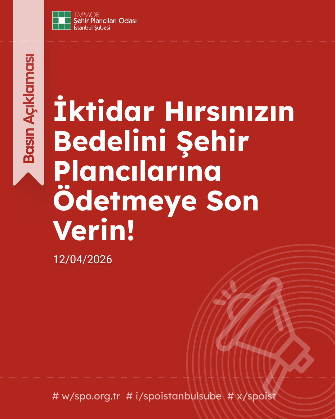 TMMOB Şehir Plancıları Odası İstanbul Şubesi olarak; meslektaşlarımızın ve kamusal sorumluluğu nedeniyle haksızca hedef alınan tüm bireylerin yürüttüğü hizmetlerin meşruluğuna olan inancımızı yineliyoruz. Hukuki dayanaktan yoksun, yargı eliyle yürütülen bu cezalandırma düzenine derhal son verilmeli ve haksızca tutuklanan tüm isimler ivedilikle serbest bırakılmalıdır.