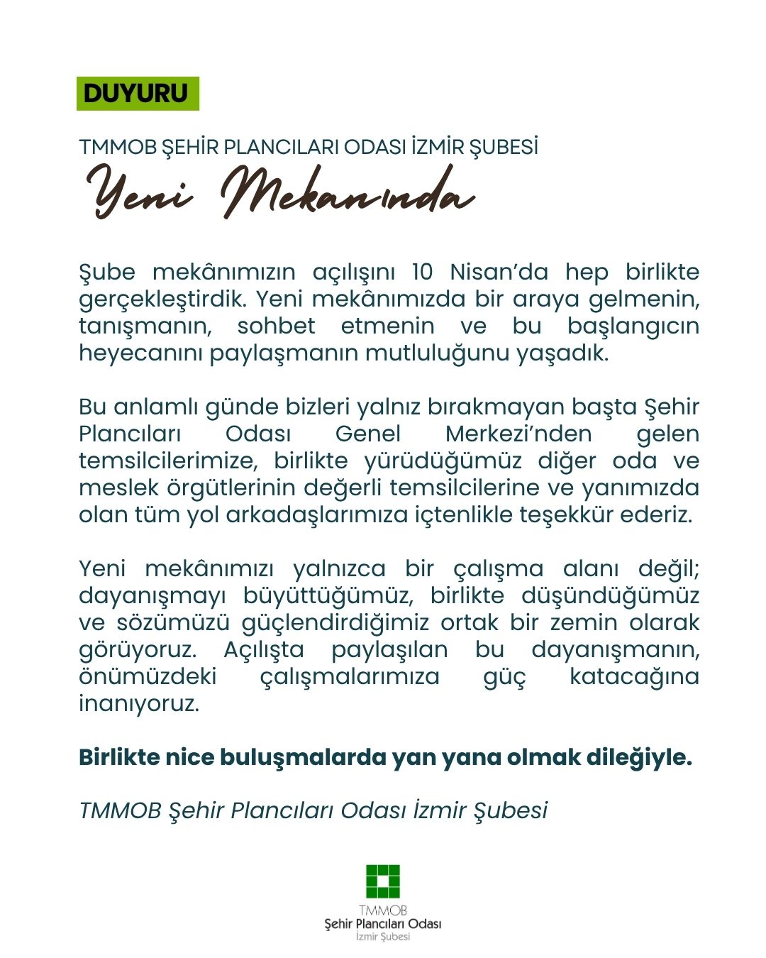 Bu anlamlı günde bizleri yalnız bırakmayan başta Şehir Plancıları Odası Genel Merkezi`nden gelen temsilcilerimize, birlikte yürüdüğümüz diğer oda ve meslek örgütlerinin değerli temsilcilerine ve yanımızda olan tüm yol arkadaşlarımıza içtenlikle teşekkür ederiz.